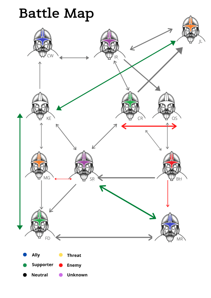 For more long-term objectives, we may start using the influence of the network to change the whole battlefield. For example, we may use our senior stakeholder to try and improve our relationship with other senior stakeholders and customers to influence and improve our standing with others on the battle map. You may even use this method to isolate an individual.