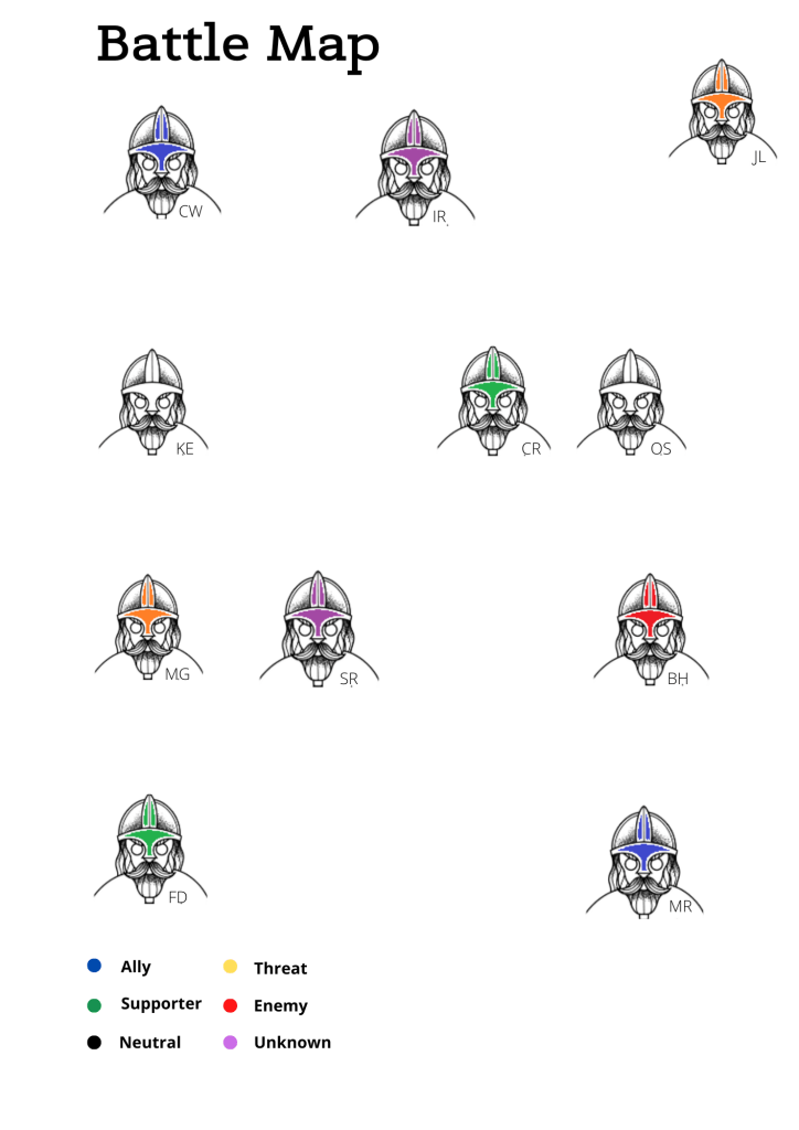 Using the current battle map, change the colour of each person to represent how they relate to your vision. Not only will this make it much more colourful, it will visualise the important relationships between key stakeholders.