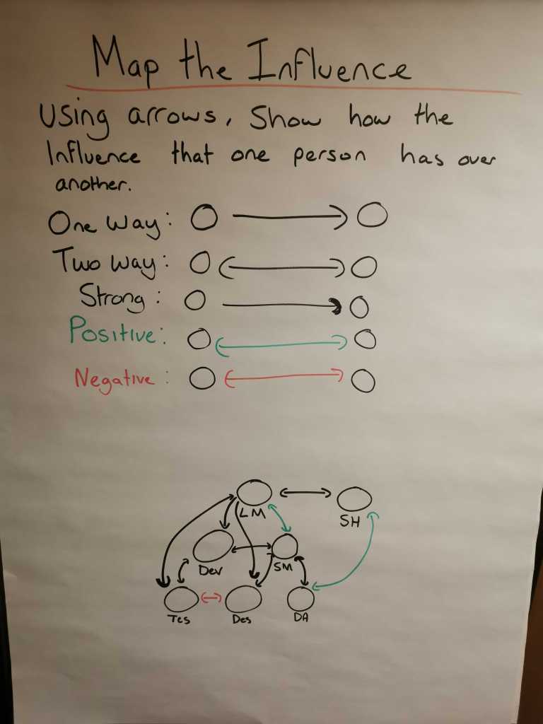 Using arrows, visualise the direction of the influence between people. This is based on what you know about relationships between people and what influence and sway they have on one another. If you do not know the influence line, don’t draw it! Wait until you know enough to do so.